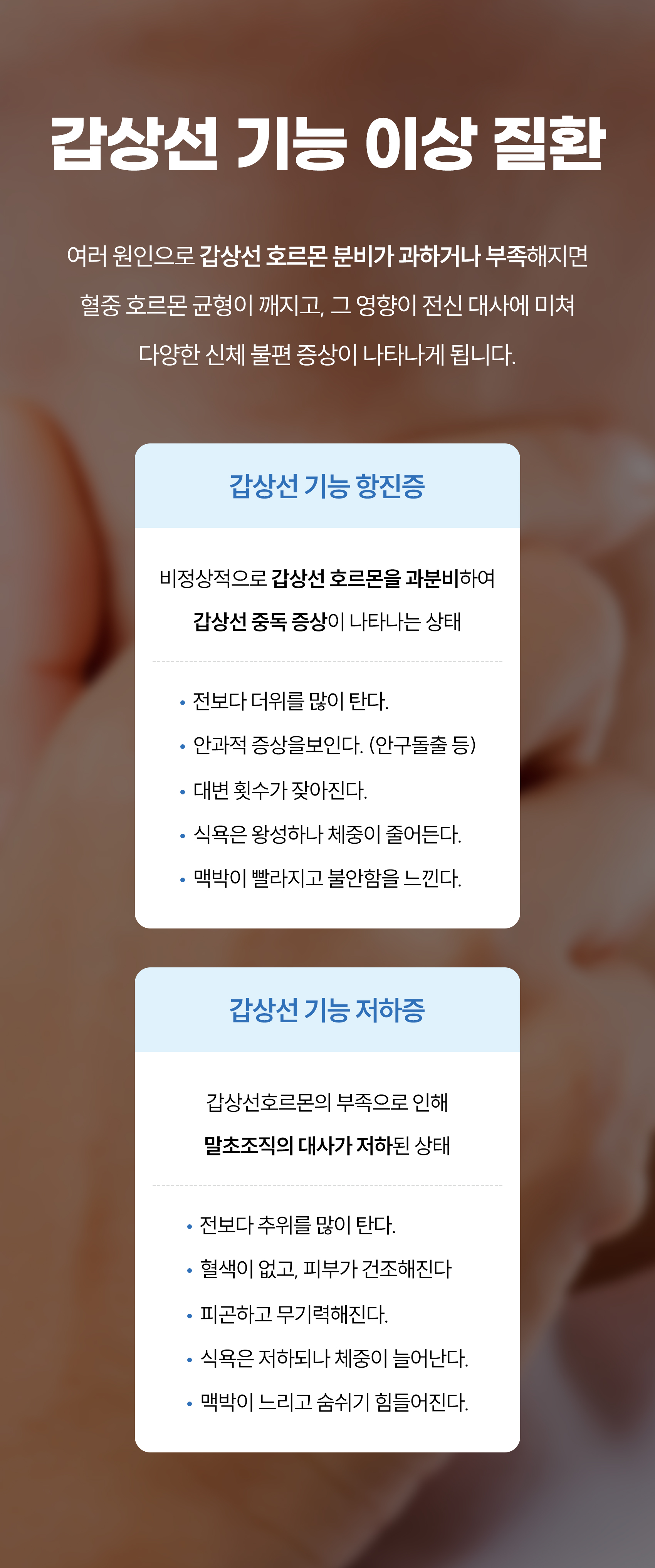 여러 원인으로 갑상선 호르몬 분비가 과하거나 부족해지면 혈중 호르몬 균형이 깨지고,