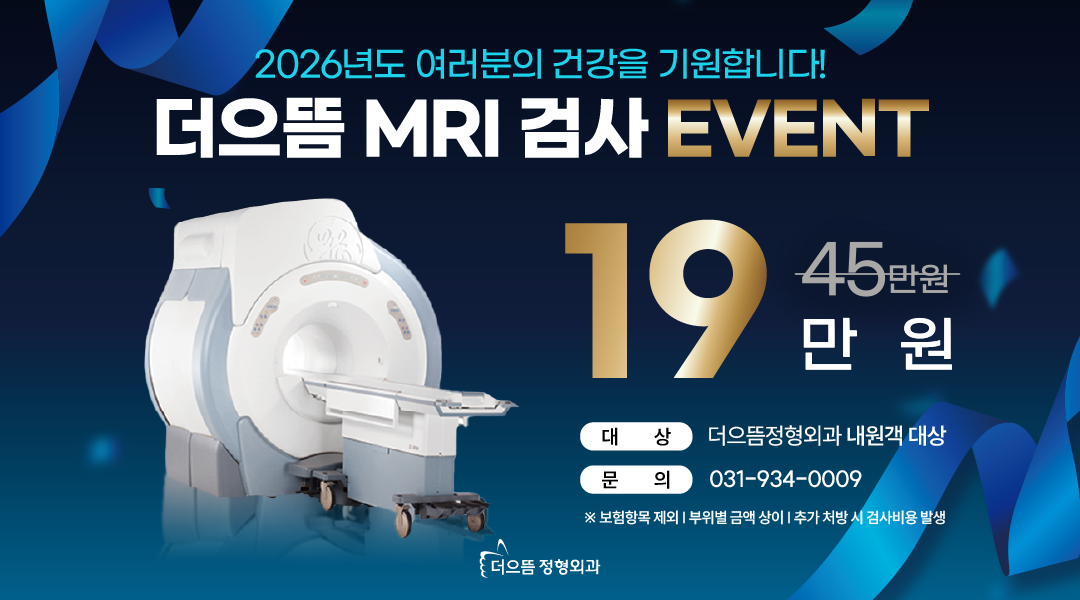 안녕하세요, 더으뜸정형외과입니다. 감사의 마음을 담아 4주년 & 외래환자 20만명 돌파 기념 MRI 할인이벤트 진행합니다. ※ 할인가격 : MRI 45만원 → 19만원 ※ 대상 : 더으뜸정형외과 내원환자 더으뜸정형외과에서는 영상의학과 전문의가 영상을 판독함으로써 보다 정밀하고 체계적인 검사가 가능합니다. 궁금하신 점은 언제든 문의해 주시기 바랍니다. 감사합니다. 문의: 031 - 934- 0009