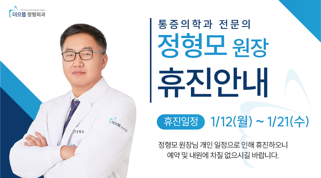 안녕하세요! 더으뜸 정형외과입니다. 정형모 원장님 휴진 일정 안내드립니다. 1월 12일(월) ~ 1월 21일(수) 정형모 원장님 휴진 으로 진료 일정에 변화가 있으니 내원 예정이신 분들은 참고하셔서 계획에 차질이 없으시길 바랍니다. 감사합니다.