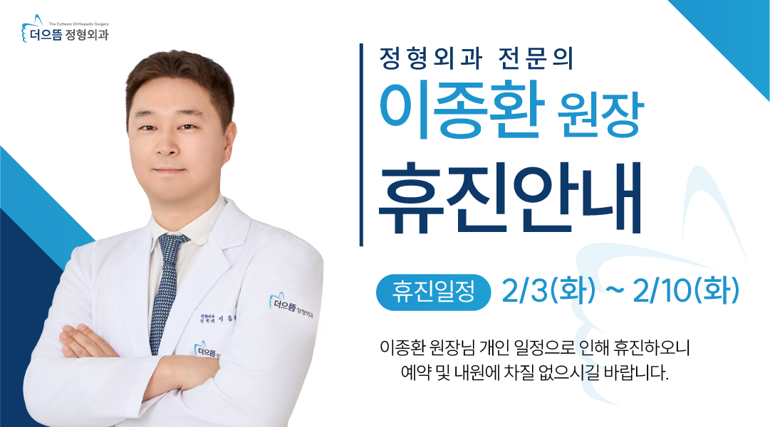 안녕하세요! 더으뜸 정형외과입니다. 이종환 원장님 휴진 일정 안내드립니다. 2월 3일(화) ~ 2월 10일(화) 이종환 원장님 휴진 으로 진료 일정에 변화가 있으니 내원 예정이신 분들은 참고하셔서 계획에 차질이 없으시길 바랍니다. 감사합니다.