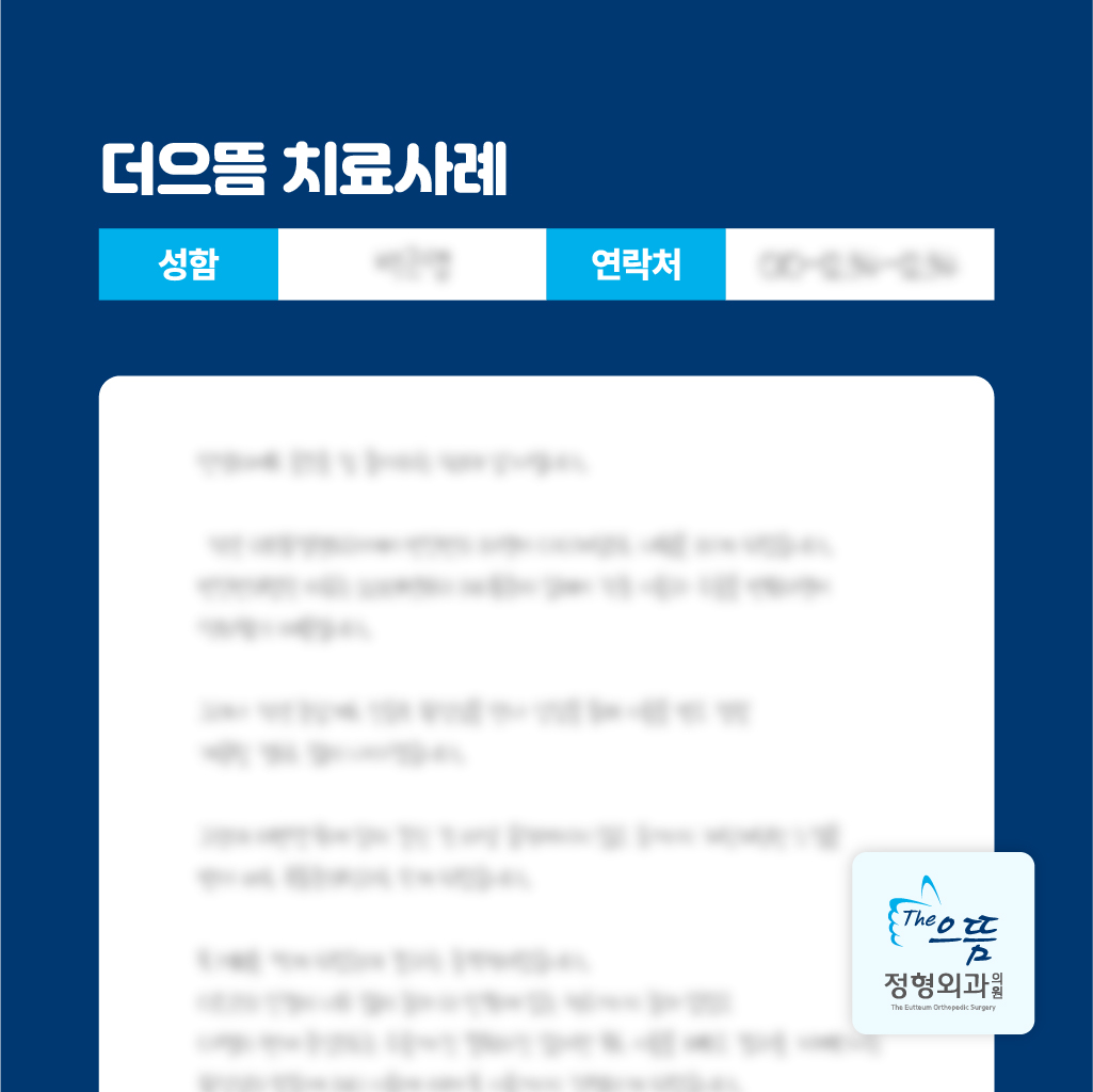 더으뜸정형외과의원은 회원 가입에 필요한 최소한의 개인정보만을 취득하며, 수집된 정보는 홈페이지 회원 관리를 위한 용도로 사용합니다.
